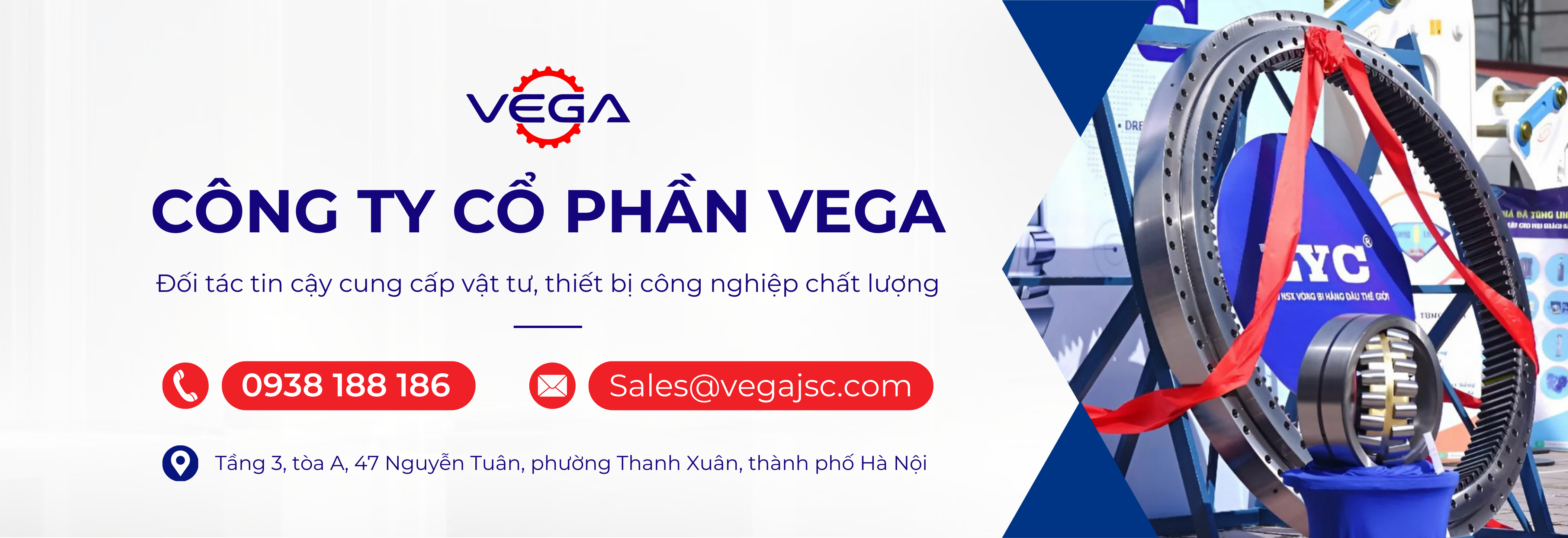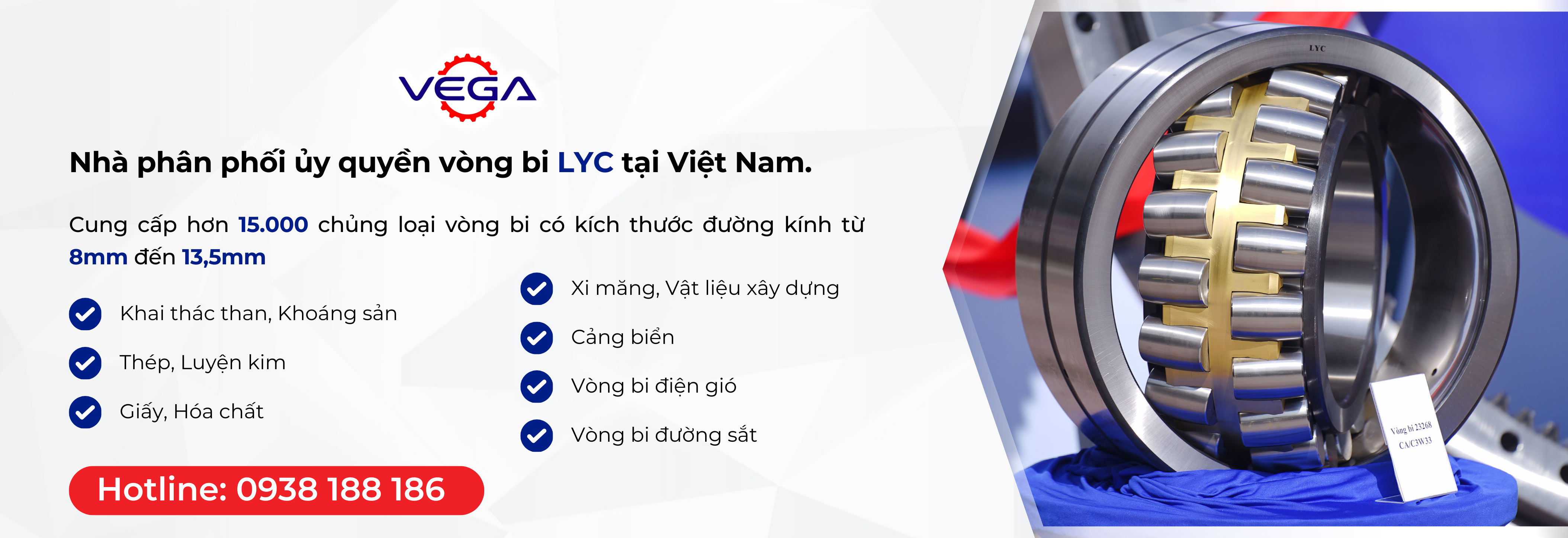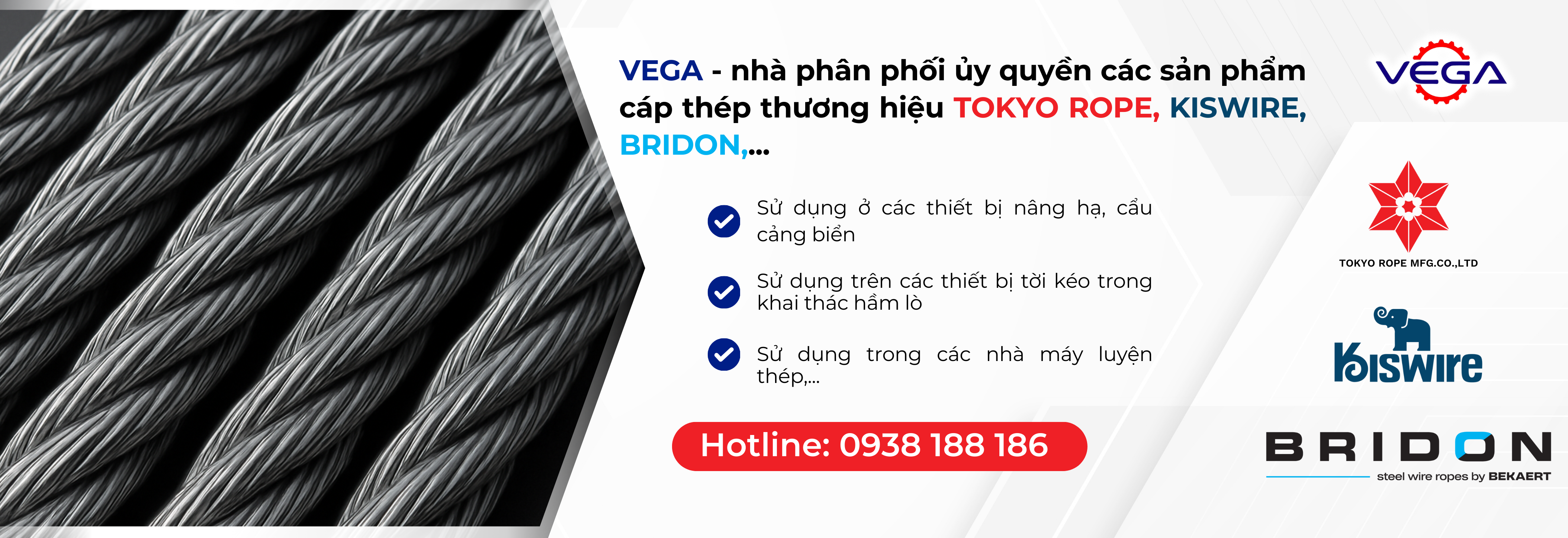 Là đối tác tin cậy và là đại diện phân phối nhiều thương hiệu nổi tiếng thế giới tại thị trường Việt Nam như: vòng bi công nghiệp LYC; cáp thép TOKYO ROPE, KISWIRE, BRIDON, ống thủy lực IMM, GATES, DICSA, hộp số, biến tần, dịch vụ tự động hóa,… Công ty cổ phần Vega luôn tự hào là một trong những đơn vị cung cấp sản phẩm uy tín và chất lượng nhất cho các ngành công nghiệp :
